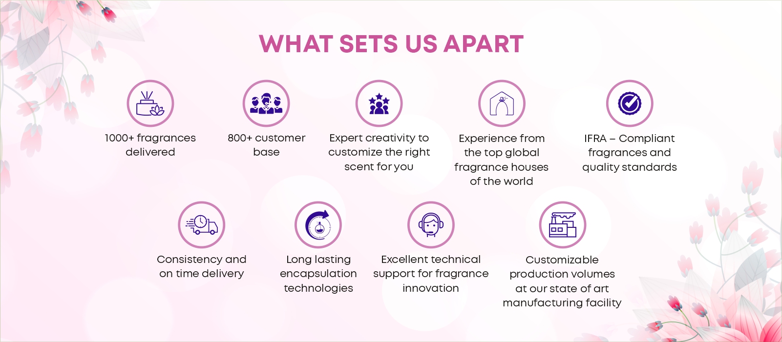 Our founder brings his learnings of fragrances and cosmetics from France and Italy, along with his experience of working with global fragrance houses such as IFF, Symrise and Firmenich. He has created bespoke fragrances for renowned Indian companies including Unilever, P&G, Godrej, Wipro, and others. We understand that scent gives a unique identity to your product.